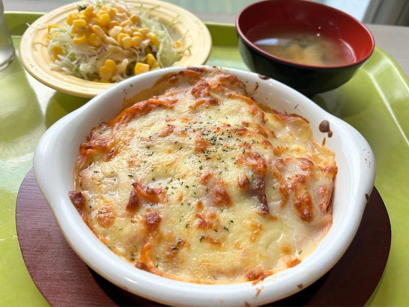 この日の日替わりランチ。グラタン風スパゲッティーにコーンサラダと味噌汁。 定食のご飯は学生は大盛無料。4~7割が大盛をオーダーするそう