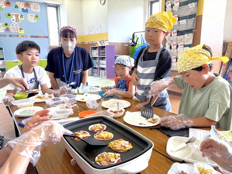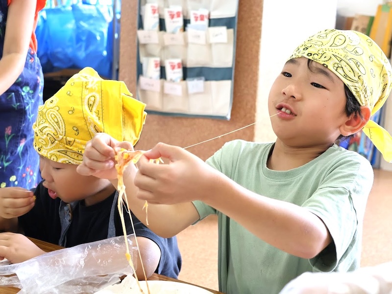 風鈴づくりの後は、米粉の餃子の皮を使うミニピザ作り。鉄板の上で一枚ずつ焼きながら、子どもたちは自由にトッピングしていきます。出来上がったピザを頬張りながら、チーズがビヨーンと伸びるのをうれしそうに笑う子どもたち。その瞬間にもまた、新しい会話が生まれていきました。