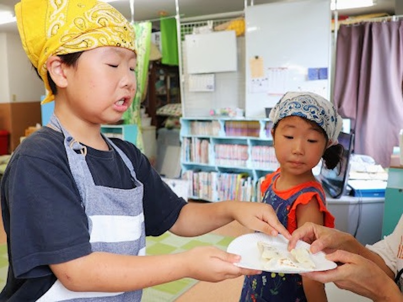 また別の子は、取材中に「まだ喋ってるの?」と笑いながら顔をのぞかせてきました。しばらくすると、ほっぺにチョコをつけながら、作ったピザとチョコを包んだスイーツ餃子をそっと差し出してくれました。