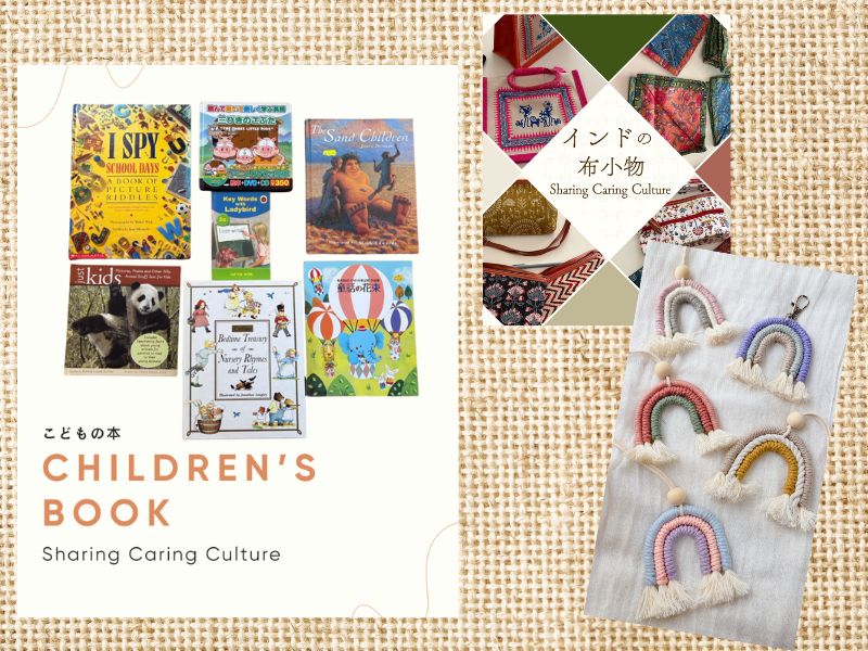 子ども服や洋書の絵本、おもちゃが並びます。インド出身のメンバーによる布小物の販売も。「マクラメコードでつくる にじのチャームワークショップ」もぜひ楽しんでくださいね。