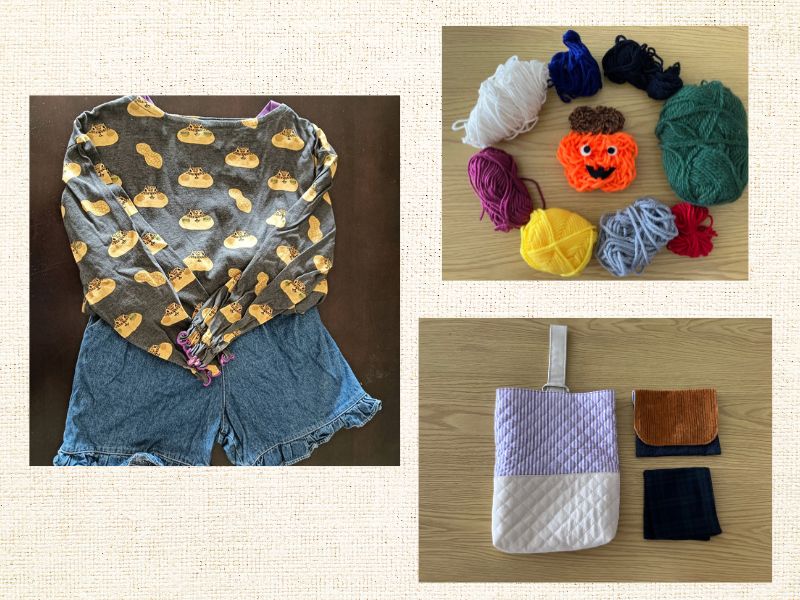 さらに、めぐる布市やリサイクルショップ、フリーマーケットで誰かが手放した毛糸たちを集め、小さい子どもでもできるゆびあみのワークショップをします。ハロウィンを楽しむコースターや、リース、誰も思いつかないぬいぐるみを作ってみてもOK!2色の毛糸で作ってもらうので、親子で一色ずつ編んで、一つのものを作ってもいいですね。