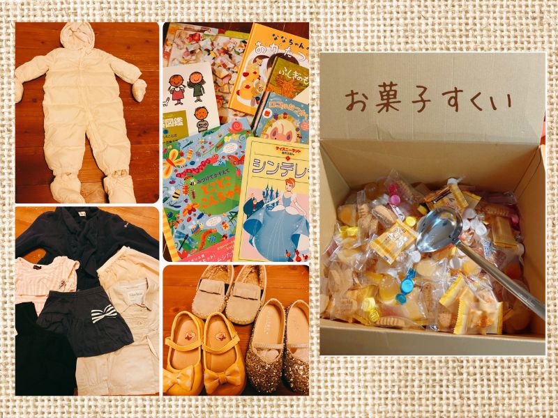 子ども服や絵本、おもちゃ、お菓子すくいゲームなどを並べます。お菓子は安心安全な素材でできでいます。お子さん、また大人にも人気のおいしいお菓子です。お待ちしています。