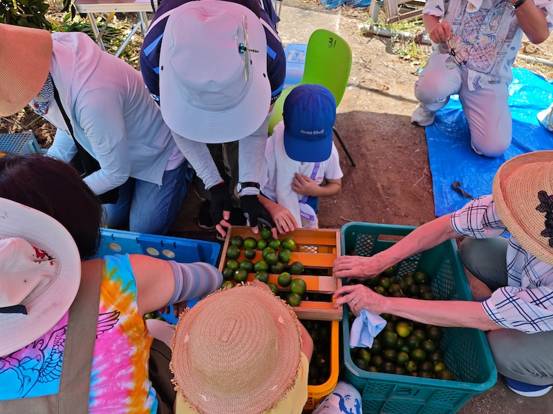 奥井さんは「商品や摘果体験を通して、アマンダリーナの活動や青みかんの魅力を知ってもらうきっかけになればうれしい」と話します。今年は2日間の摘果体験に、100名の参加があったそうです!奥井さんの明るい人柄や、地産地消や資源循環という社会的な価値のある活動への共感から、関係人口も自然と広がり、関心や口コミが広がっているのだと思いました。