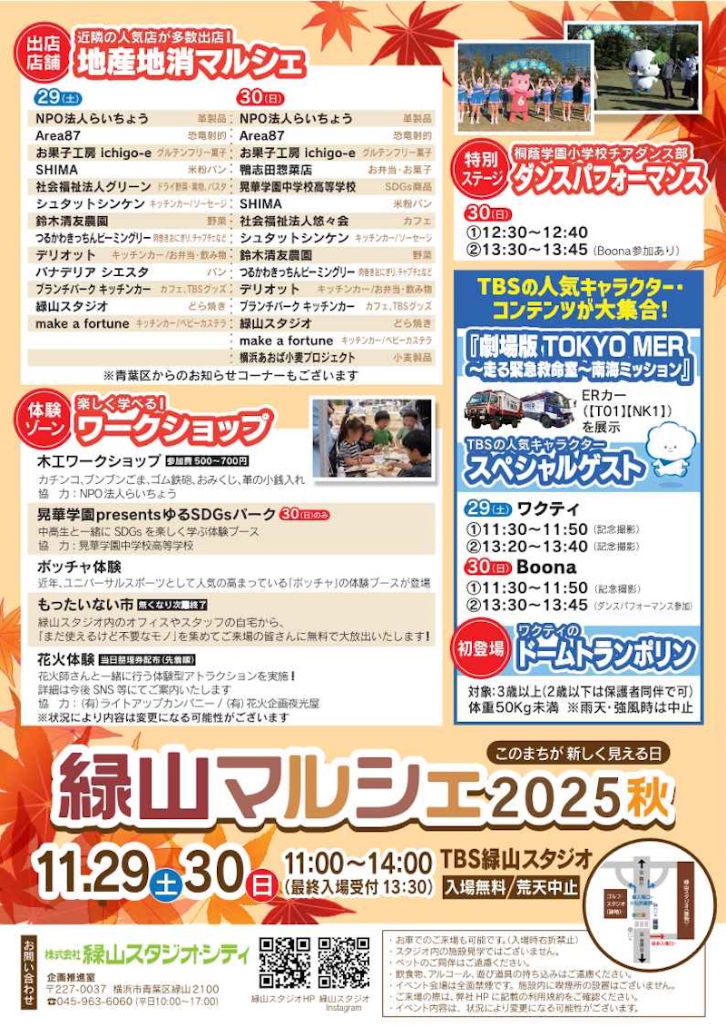 緑山スタジオで、マルシェが春に続いてこの秋も開催されます。今回はうれしいことに2日間楽しめます。広々とした会場には、さまざまな出店ブースに加えて、スペシャルゲストにTBSキャラクターも登場します。桐蔭学園小学校チアダンス部によるステージ披露も楽しみですね。