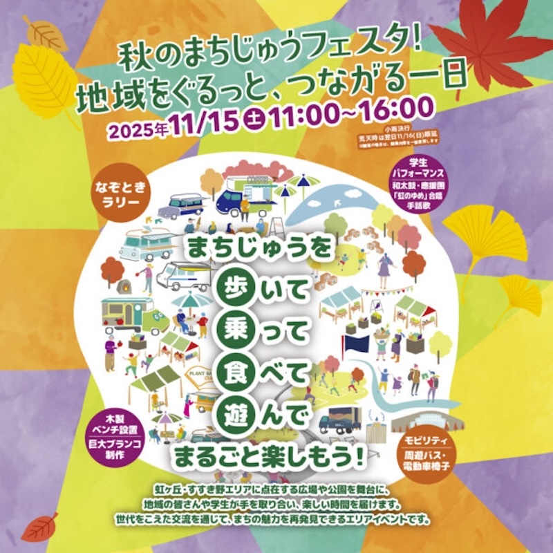 虹ヶ丘、すすき野エリアの広場や公園を舞台にした、秋のまちじゅうフェスタです。地域住民や学生たちが協力し、地域をつなげるイベントです。無料の回遊バスも運行します。楽しくまるごと、この地域の魅力を知るチャンスです。