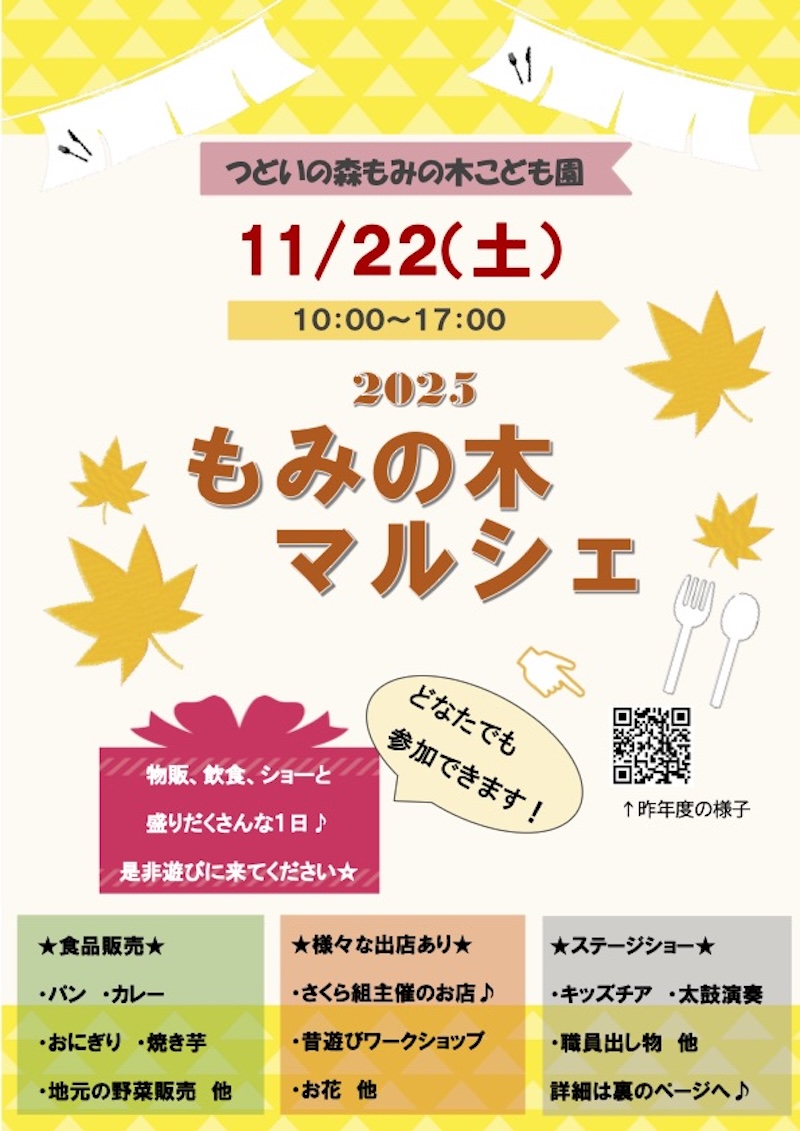 横浜市青葉区もみの木台のつどいの森もみの木こども園で開催されるマルシェです。5歳児のこども達が出店するほか、地域住民や職員の出し物、キッチンカーの出店もあります。どなたでも参加できるので、かわいい園児たちと触れ合いましょう。HPもご覧ください。