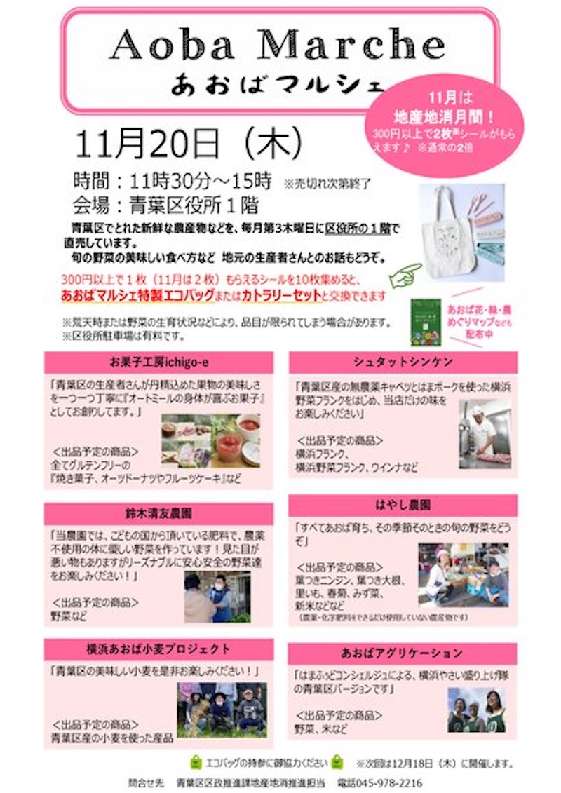 青葉区役所では、地産地消が暮らしの中で身近に感じられるようにと、毎月第3木曜日にマルシェを開催しています。お買い物300円ごとにもらえるあおばマルシェクラブのシールは、11月は地産地消月間のため2倍もらえます。この機会にオリジナルグッズをぜひゲットしましょう。