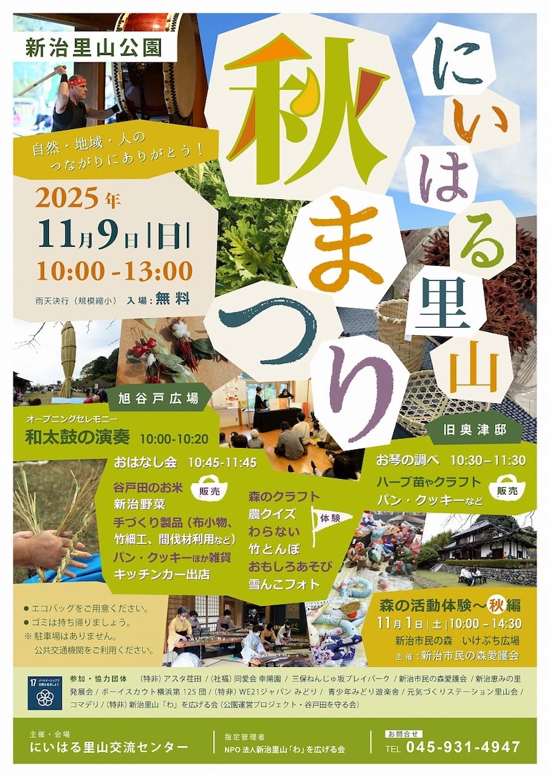 自然環境が素敵な新治里山公園で繰り広げられる、自然と地域と人のつながりに感謝する恒例のイベントです。和太鼓のオープニングセレモニーからスタートして、新治野菜や、谷戸田のお米などの物販販売をはじめ、おはなし会やお琴の調べも楽しめます。