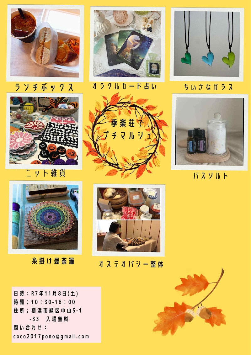 JR横浜線・中山駅から徒歩7分にある会場の「季楽荘」は、季節を楽しみ、気楽にさまざまな人とのコミュニケーションを楽しむ拠点です。その季楽荘で、小規模ながらも質の高い多彩な出店者が集うマルシェが定期的に開催されています。