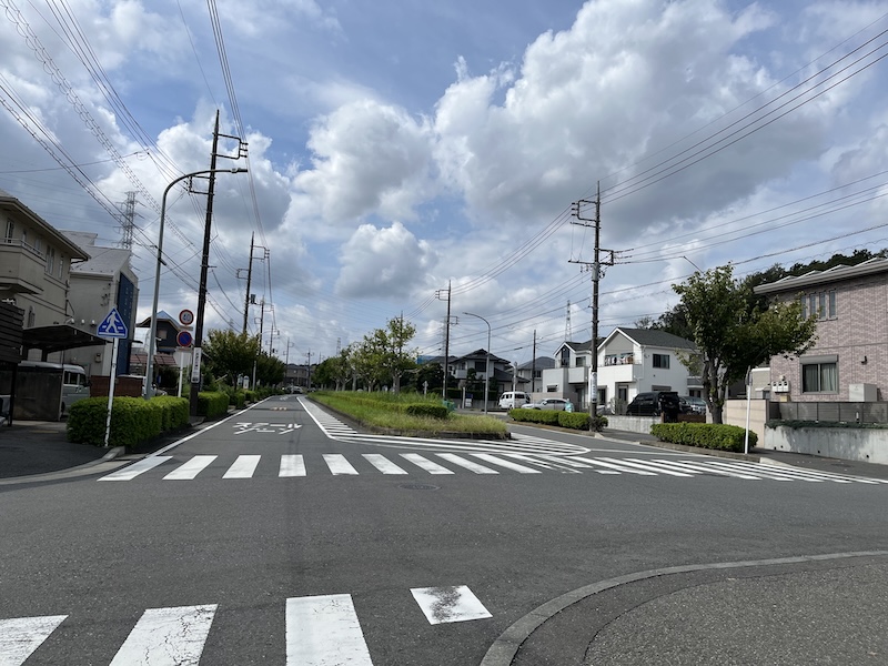 家族連れでにぎわう電車を降りて無人の改札口を出ると、広い道路を挟んで閑静な住宅地が、その向こうに見える山にはお寺が見えます。駅前とは思えない、のどかな光景が広がっています。