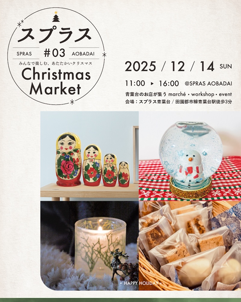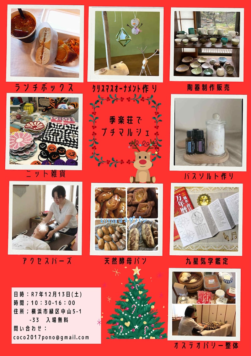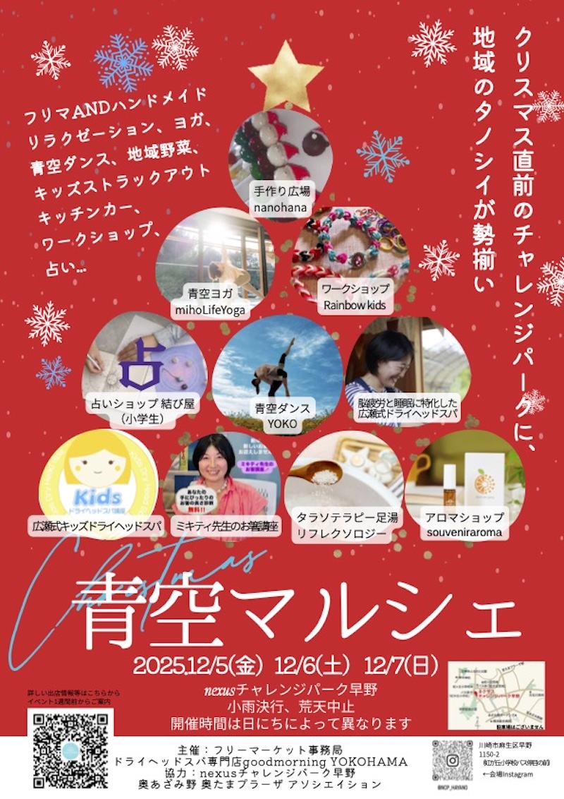 青葉台郵便局2Fにある、コミュニティ・コワーキングスペース「スプラス青葉台」で恒例のクリスマスマーケット!青葉台地域のお店が集います。大切な方へ素敵なクリスマスプレゼントを見つけられそうです。詳細はHPをご覧ください。