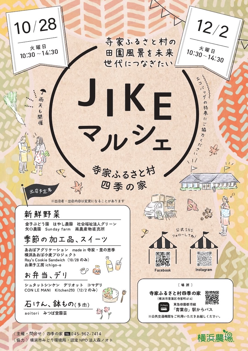 「寺家ふるさと村の田園風景を未来世代につなぎたい」をコンセプトに年4回開催しているマルシェです。いよいよ12月は今年度最後の開催です。前から気になっていた、という方この機会にぜひお越しください。寺家町産をはじめとした、農産物、加工物、お弁当など、のどかな景観と共にお楽しみください。