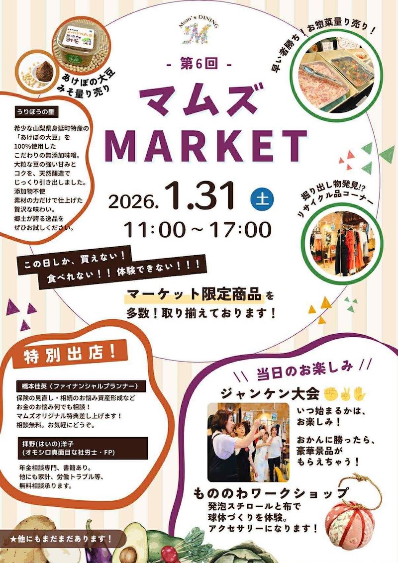米粉のシフォンケーキでおなじみのさくら工房さんが手がけるMom’sダイニングさんでMARKETを開催しています。お惣菜の計り売りや無農薬野菜から、ワークショップにお金のお悩み相談まで!幅広いラインナップです。