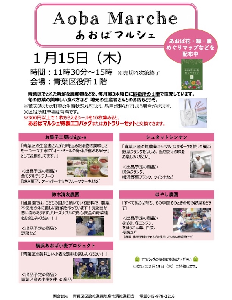 青葉区役所では、地産地消が暮らしの中で身近に感じられるようにと、毎月第3木曜日にマルシェを開催しています。お買い物300円ごとにもらえるあおばマルシェクラブのシールを集めてオリジナルエコバッグやカトラリーをGETしませんか。