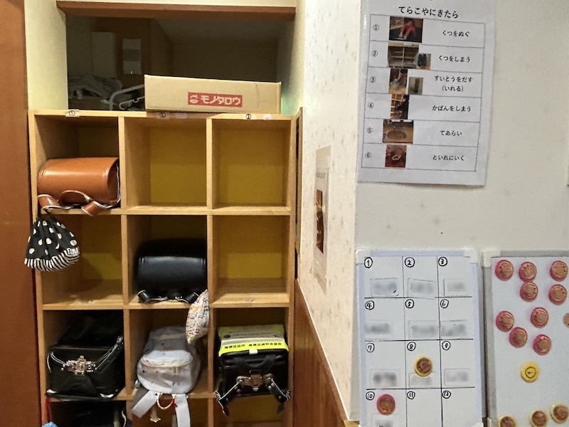 入り口の荷物置き場、自分の持ち物もきちんと管理できるように工夫がされています。「できた」という小さな成功体験が、自己肯定感を上げていきます