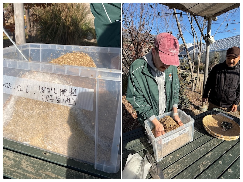 見せていただいた「ぼかし肥料」。3~4週間ででき、最初の2週間は毎日混ぜてあげるそうです