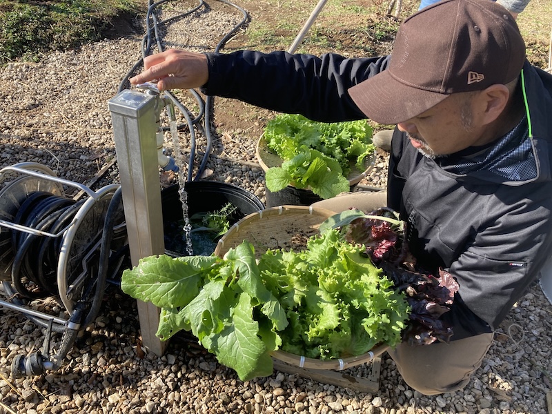 案内してもらいながら収穫していくと、気づけば、葉野菜がざるいっぱいに。私の母も無農薬で野菜作りをしていますが、虫の被害にあったりして見た目はきれいとは言えないのですが、土EN FARMの野菜はきれいで驚きました。自然農法における微生物の力の偉大さを改めて感じました。