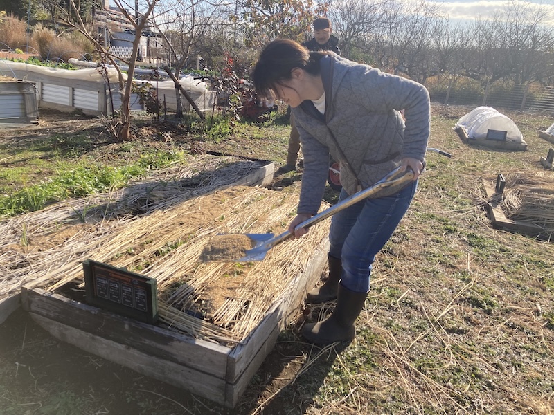畑も、私は地面を盛り上げた形しか見たことなかったのですが、こちらは「レイズドベッド」というベンチ栽培だそうです。土は、見える表面部分に薄く敷いてあるだけで、木枠の中には丸太や枝、枯葉、竹炭、もみ殻などが何層も敷き詰められていて、これらがゆっくりと時間をかけて微生物が豊富な良い土になるそうです。
