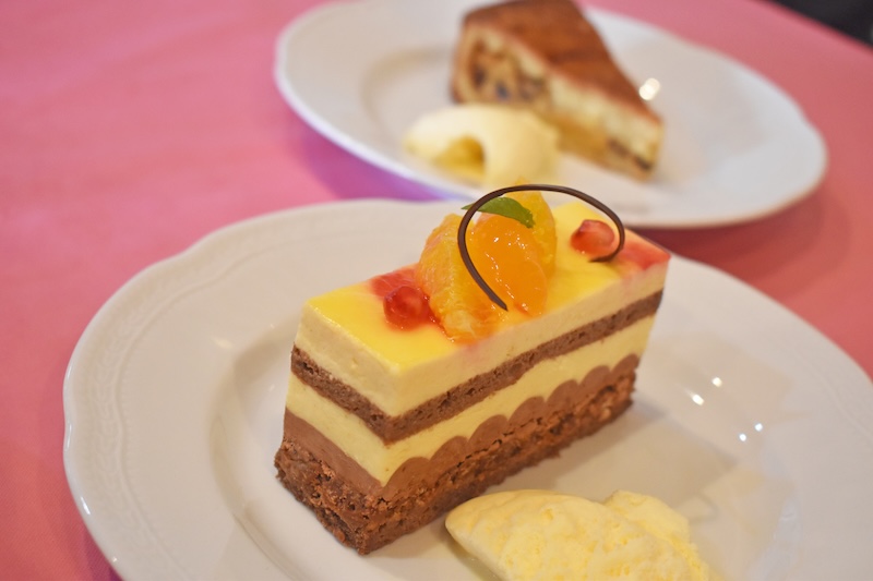 手前がショコラオランジュ、奥がガトーバスクです。お店にはリヨンのパティスリーで学ばれた写真が飾られていました