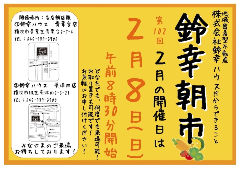 定期開催を続けて12月で100回を迎えました。地域密着型不動産の鈴幸ハウスが開催している鈴幸朝市は、地元農家さんの野菜を仕入れ販売し、利益は地域活動の補助金として全額寄付・寄贈しています。わたしたちは新鮮野菜を買うことで、地域貢献もできますね。