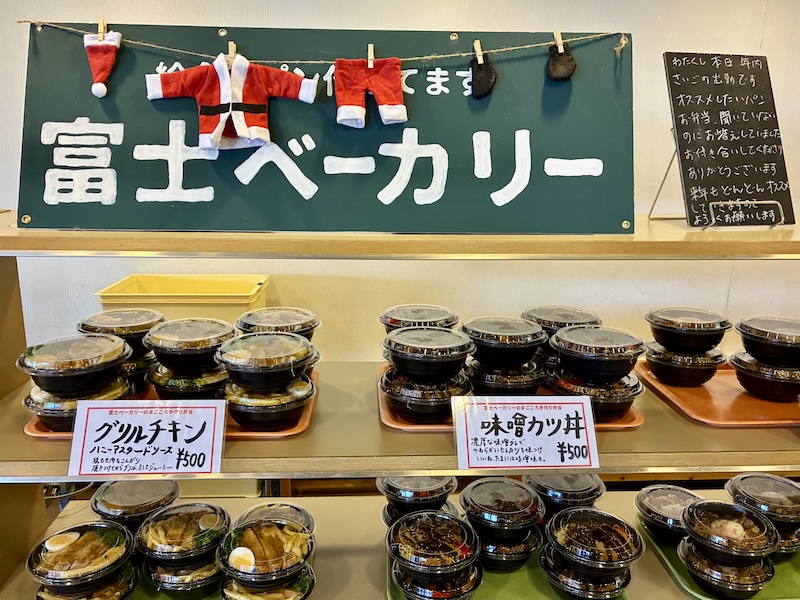 お話を伺ったのは、学食チームを率いる大和久歩由(おおわく・あゆ)さん(トップの写真右)。一緒に看板を持っているのは、歩由さんの夫(富士ベーカリー社長)のお母様、大和久のり子さんです。この看板は歩由さんの手書きです。店内外あちこちにある黒板やメニュー表示などもかわいい手書き文字で書かれていて、SNSで見たそのままの楽しい空気感が漂っていました。