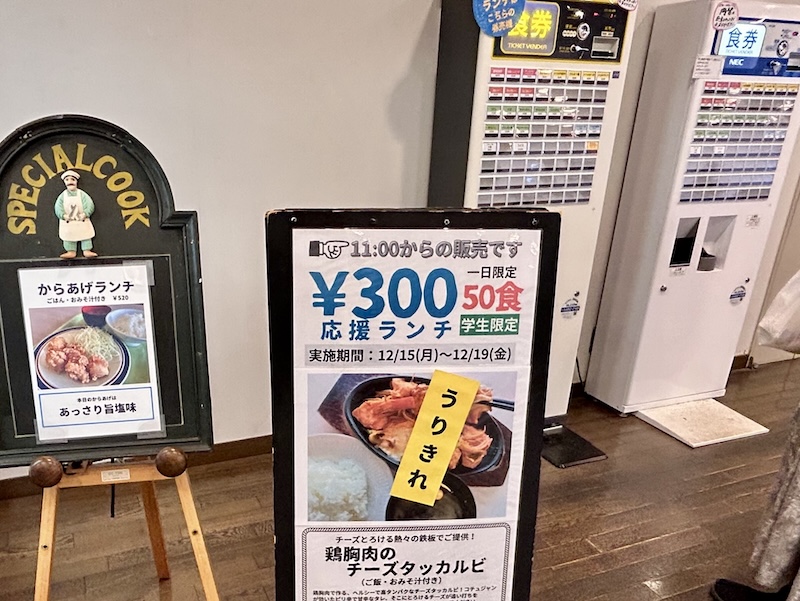 毎月、「学生限定の応援ランチ週間」もあります。300円で数量限定のため大人気。取材当日はちょうど期間中で行列ができており、12時前には販売終了していました