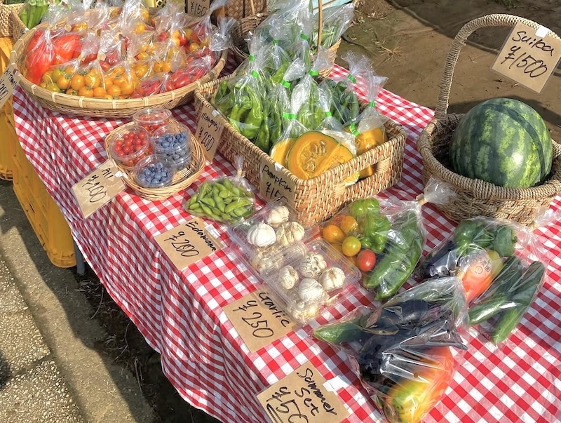 畑の入口にテーブルを出して青空の下、野菜を売り始めた大入農園。赤いギンガムチェックの布が敷かれて、10種類以上ものカラフルな夏野菜が並び、見ているだけでも元気がもらえました
