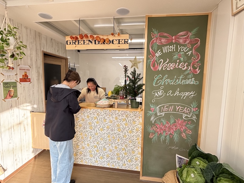 シーズンごとに描きかえる真歩さん自作の黒板アート。クリスマス前にはMerry ChristmasならぬVeggies Christmasと書かれていました