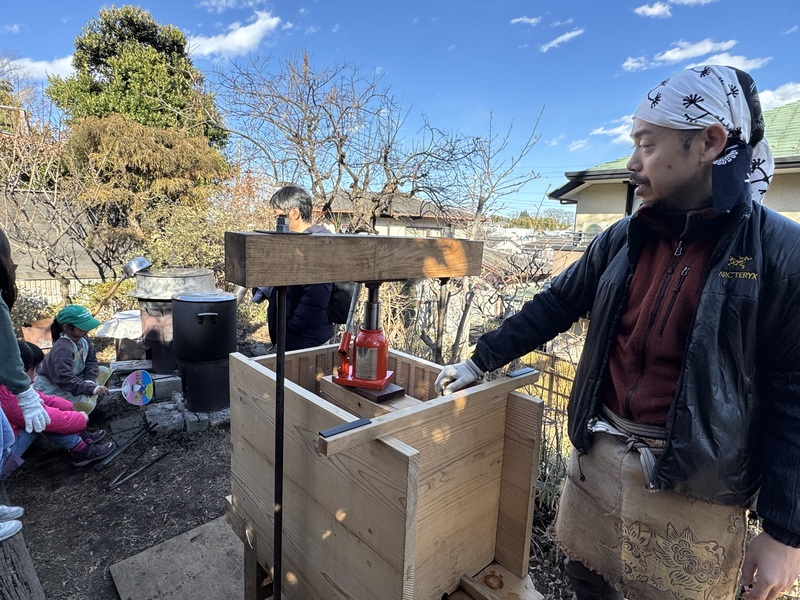 緑区で青空自主保育をしている仲間たちと一緒に醤油を搾る大谷さん(菌カフェ753の庭にて)