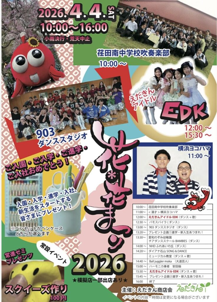 今年も開催!えだきん商店街恒例の春まつりです。おまつりスタートから次々に繰り広げられるステージは盛り上がること間違いなしです。もちろんえだきんアイドルEDKも登場。模擬店など内容盛りだくさんです。楽しい1日になることでしょう。詳しくは、えだきん商店会のHPをチェックしてください。