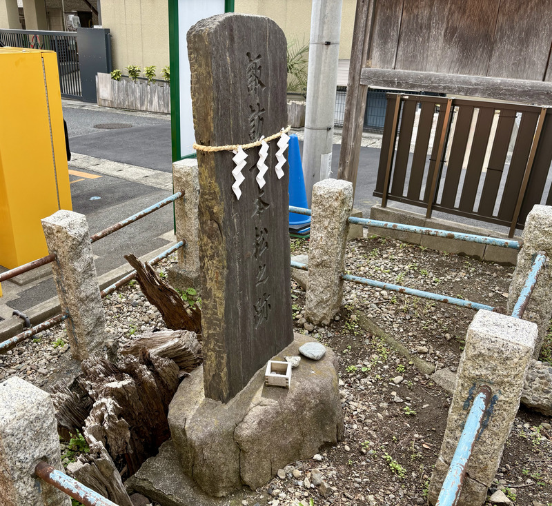 石碑の裏に守られるように、枯れた巨木の根本部分がありました。横に立てられた看板を読んでみると……