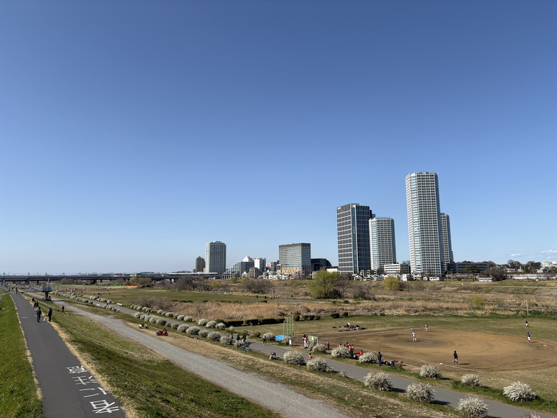思わず両手を上に伸ばして背伸びをしたくなるような、開放的な景色が広がっていました。犬の散歩、少年野球やサッカー、ジョギング……人それぞれの楽しい時間を一望できるのも、広々と整えられたこの河川敷の魅力だと感じます。