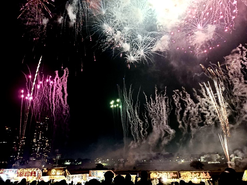 毎年10月に開催される「たまがわ花火大会」では、二子玉川の高層の建物を背景に、迫力のある花火が上がります。川沿いに屋台がずらりと列を成し、灯りが夜を照らす景色も圧巻です。