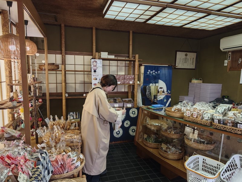 一本松から数分ほど歩くと、濃紺ののれんが映えるお煎餅屋さんがありました。どこか懐かしさを感じさせるたたずまいに、足が吸い寄せられます。