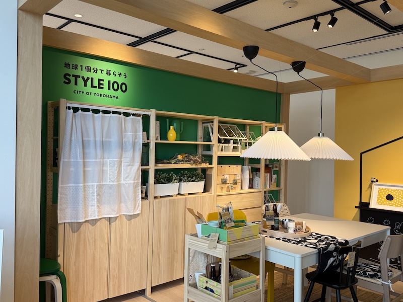 GREEN EXPO 2027の開催500日前を迎え、横浜市役所で「地球1個分で暮らそう STYLE100」の新プロジェクト発表会と展示お披露目会が開かれました。IKEA横浜が演出協力する展示の中で、めぐる布市のポジャギ風カーテンが紹介されました。